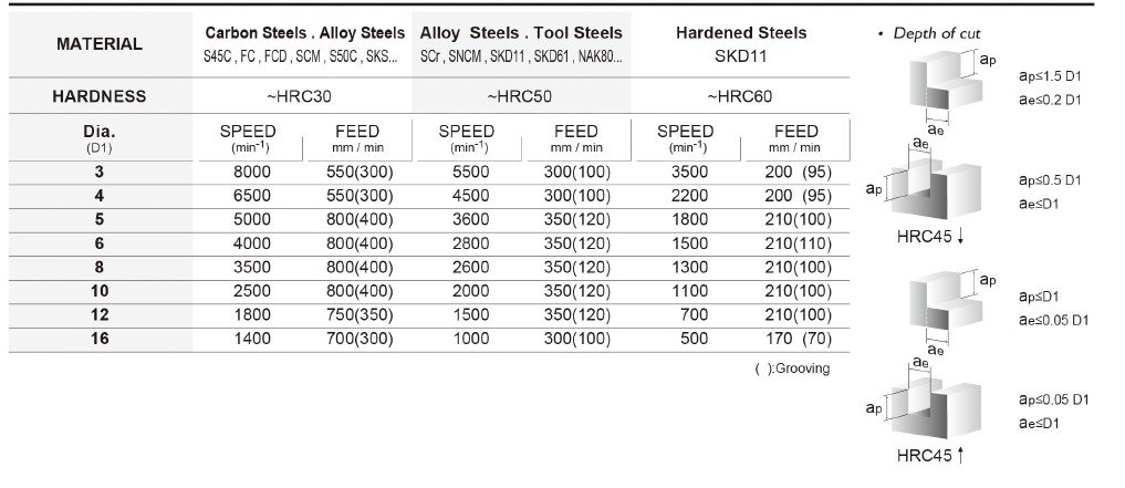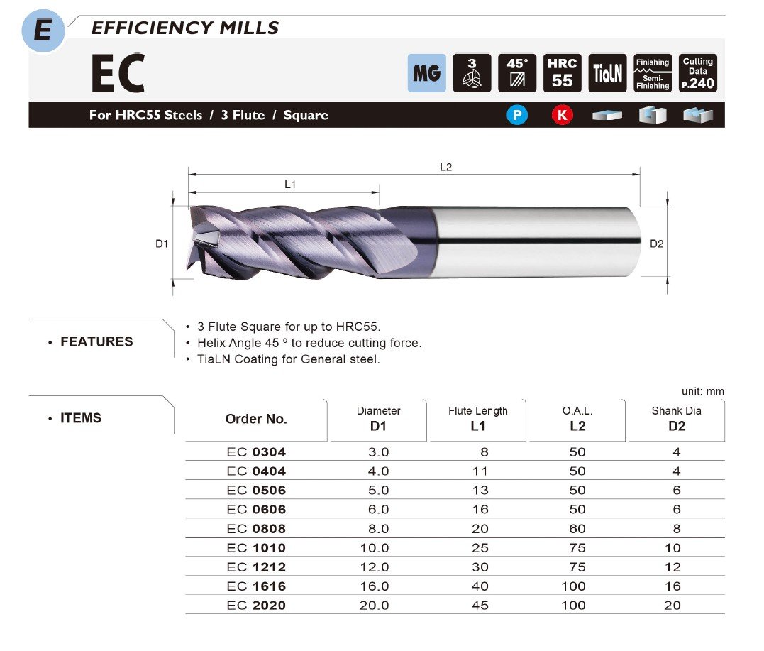 Základem je také kvalitní materiál se speciálním výbrusem pro obrábění materiálů do tvrdosti 55HRC. Vzhledem k náročnosti obrábění a tvrdosti obráběného materiálu je pro frézy EC používán substrát o velikosti zrna 0,6µm s extrémně vysokou odolností vůči lomu a současně vynikající odolností vůči opotřebení.