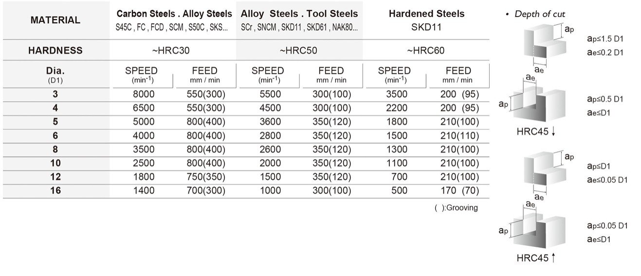 Základem je také kvalitní materiál se speciálním výbrusem pro obrábění materiálů do tvrdosti 55HRC. Vzhledem k náročnosti obrábění a tvrdosti obráběného materiálu je pro frézy používán substrát o velikosti zrna 0,6µm s extrémně vysokou odolností vůči lomu a současně vynikající odolností vůči opotřebení.