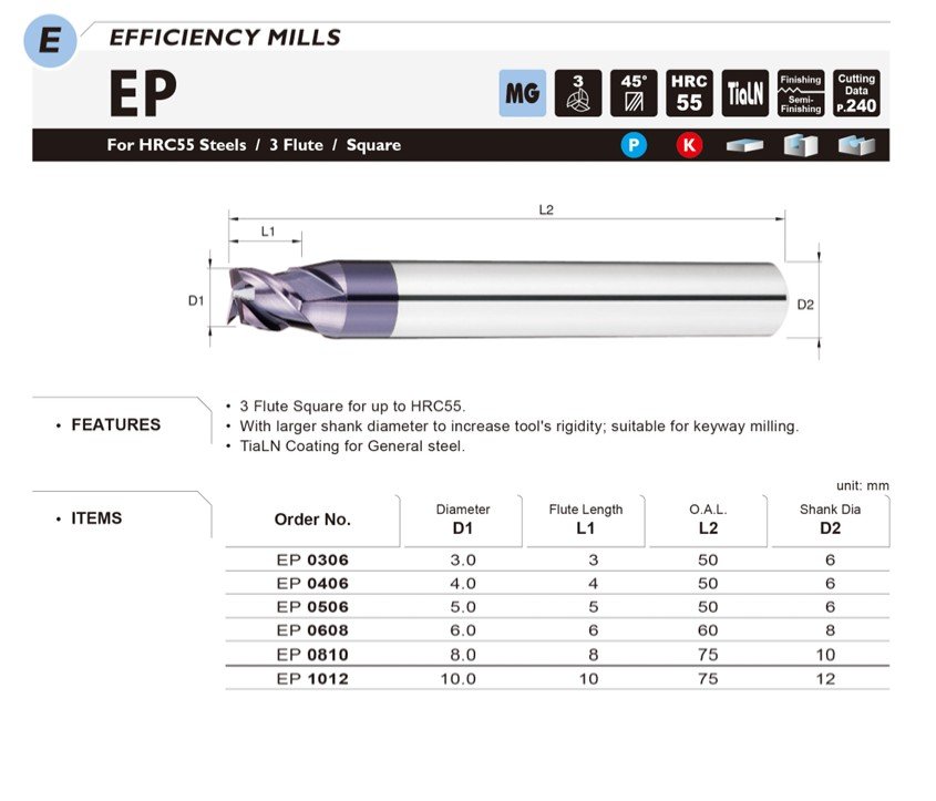 Základem je také kvalitní materiál se speciálním výbrusem pro obrábění materiálů do tvrdosti 55HRC. Vzhledem k náročnosti obrábění a tvrdosti obráběného materiálu je pro frézy používán substrát o velikosti zrna 0,6µm s extrémně vysokou odolností vůči lomu a současně vynikající odolností vůči opotřebení.