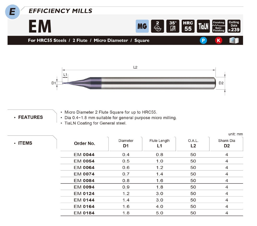 Základem je také kvalitní materiál se speciálním výbrusem pro obrábění materiálů do tvrdosti 55HRC. Vzhledem k náročnosti obrábění a tvrdosti obráběného materiálu je pro frézy EM používán substrát o velikosti zrna 0,6µm s extrémně vysokou odolností vůči lomu a současně vynikající odolností vůči opotřebení.
