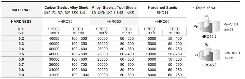 Základem je také kvalitní materiál se speciálním výbrusem pro obrábění materiálů do tvrdosti 60HRC. Vzhledem k náročnosti obrábění a tvrdosti obráběného materiálu je pro frézy používán substrát o velikosti zrna 0,5µm s vysokou odolností vůči lomu a současně vynikající odolností vůči opotřebení.