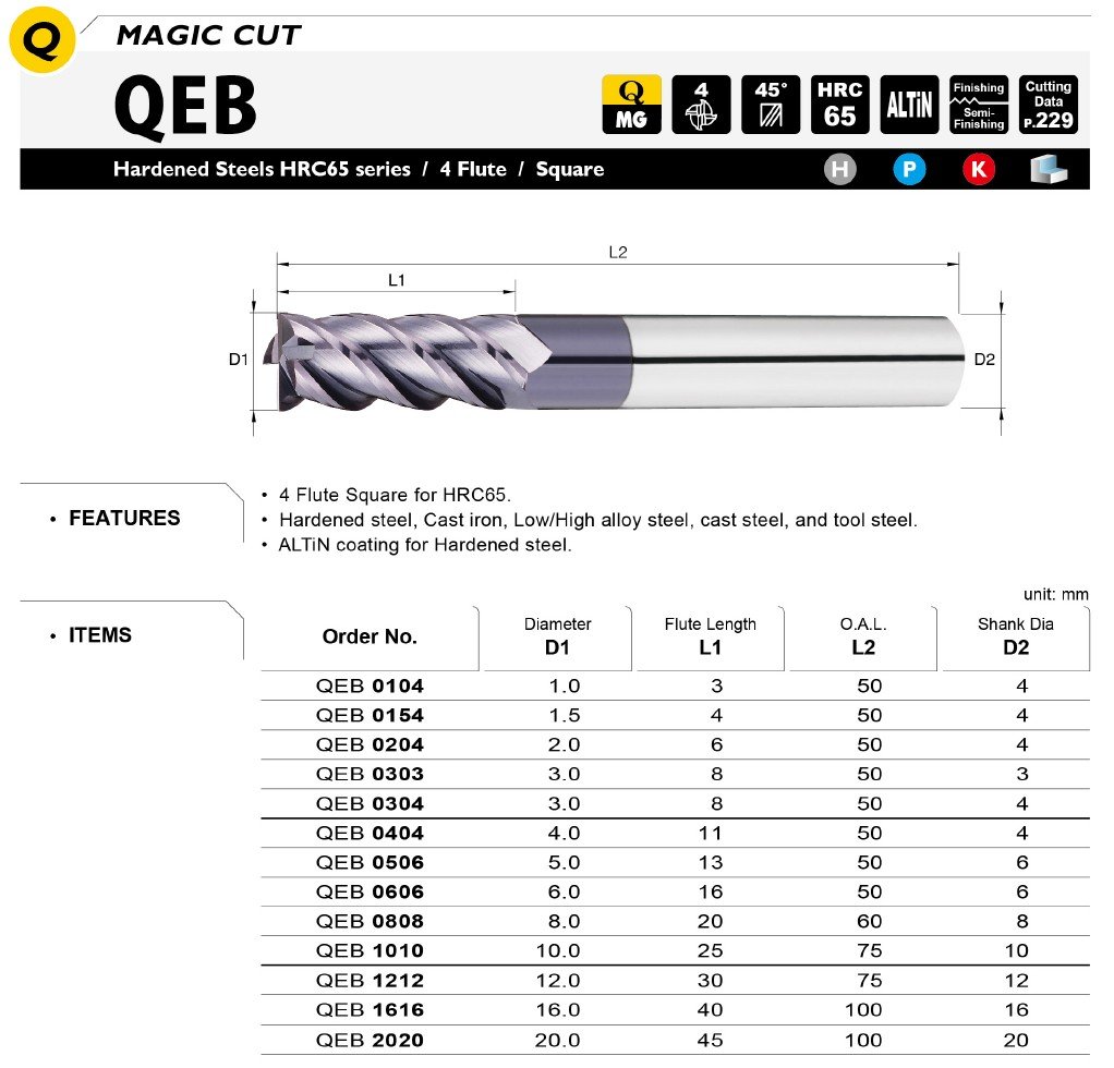 Základem je také kvalitní materiál se speciálním výbrusem pro obrábění materiálů do tvrdosti 65HRC. Vzhledem k náročnosti obrábění a tvrdosti obráběného materiálu je pro frézy používán nejjemnější substrát o velikosti zrna 0,2µm s extrémně vysokou odolností vůči lomu a současně vynikající odolností vůči opotřebení.