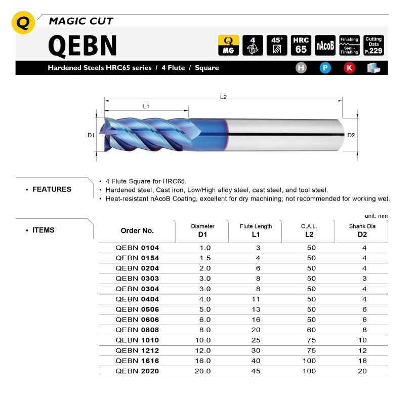 Základem je také kvalitní materiál se speciálním výbrusem pro obrábění materiálů do tvrdosti 65HRC. Vzhledem k náročnosti obrábění a tvrdosti obráběného materiálu je pro frézy QEBN používán nejjemnější substrát o velikosti zrna 0,2µm s extrémně vysokou odolností vůči lomu a současně vynikající odolností vůči opotřebení.