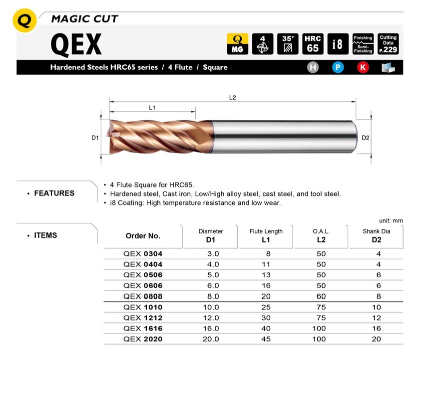 Základem je také kvalitní materiál se speciálním výbrusem pro obrábění materiálů do tvrdosti 65HRC. Vzhledem k náročnosti obrábění a tvrdosti obráběného materiálu je pro frézy používán nejjemnější substrát o velikosti zrna 0,2µm s extrémně vysokou odolností vůči lomu a současně vynikající odolností vůči opotřebení.