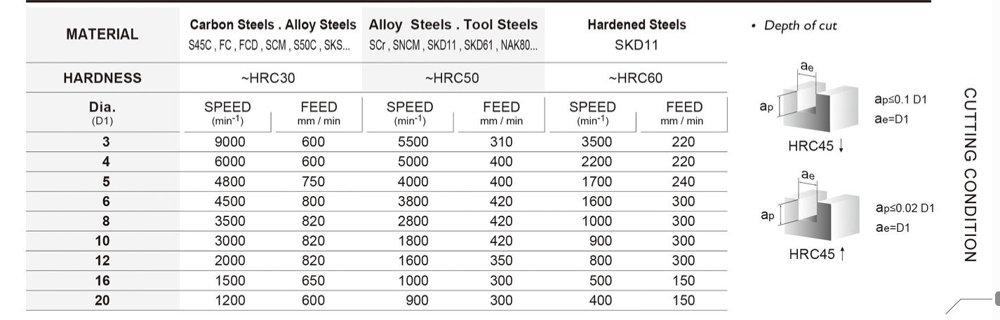 Základem je také kvalitní materiál se speciálním výbrusem pro obrábění materiálů do tvrdosti 65HRC. Vzhledem k náročnosti obrábění a tvrdosti obráběného materiálu je pro frézy používán nejjemnější substrát o velikosti zrna 0,2µm s extrémně vysokou odolností vůči lomu a současně vynikající odolností vůči opotřebení.