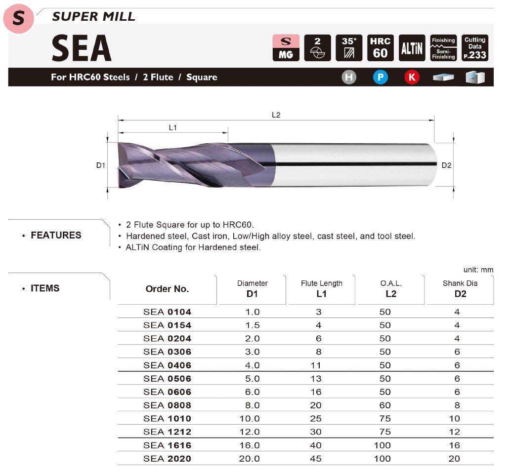 Základem je také kvalitní materiál se speciálním výbrusem pro obrábění materiálů do tvrdosti 60HRC. Vzhledem k náročnosti obrábění a tvrdosti obráběného materiálu je pro frézy SEA používán substrát o velikosti zrna 0,5µm s vysokou odolností vůči lomu a současně vynikající odolností vůči opotřebení.