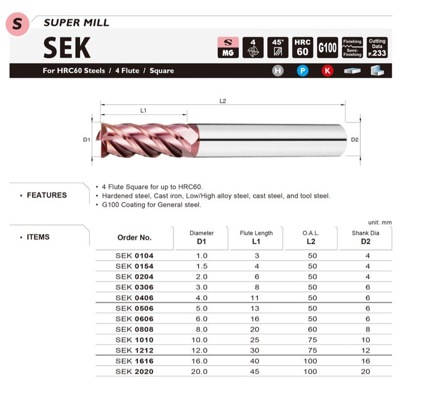 Standardní čtyřbřitá fréza pro obrábění materiálů s tvrdostí až do HRC 60. Je vhodný pro kalenou ocel, litinu, nízko- i vysokolegovanou ocel, lité oceli a nástrojovou ocel. Technologie povlakování G100 se vyznačuje tepelnou odolností a to do 800 °C.