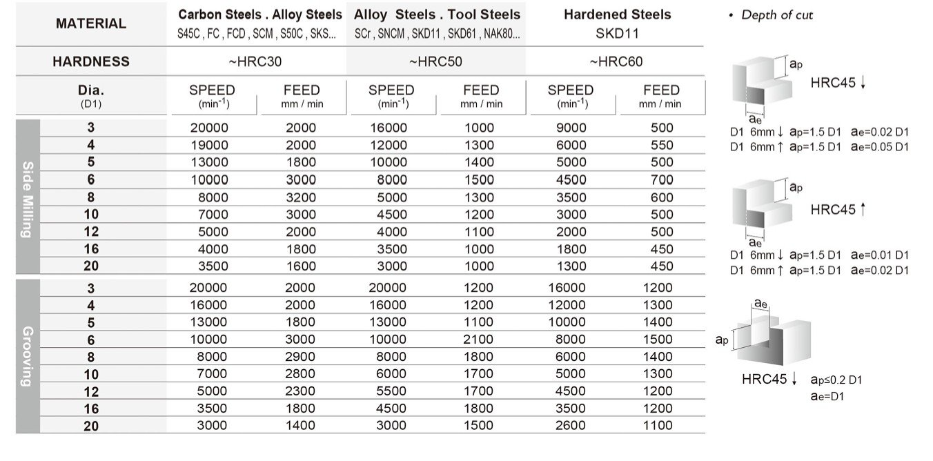 Základem je také kvalitní materiál se speciálním výbrusem pro obrábění materiálů do tvrdosti 60HRC. Vzhledem k náročnosti obrábění a tvrdosti obráběného materiálu je pro frézy používán substrát o velikosti zrna 0,5µm s vysokou odolností vůči lomu a současně vynikající odolností vůči opotřebení.