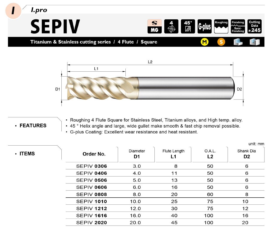 Čelní fréza pro nerezovou ocel titanové slitiny a žáruvzdorné slitiny. Technologie povlakování G-plus se vyznačuje tepelnou odolností a to do 1100 °C a odolností proti tření.