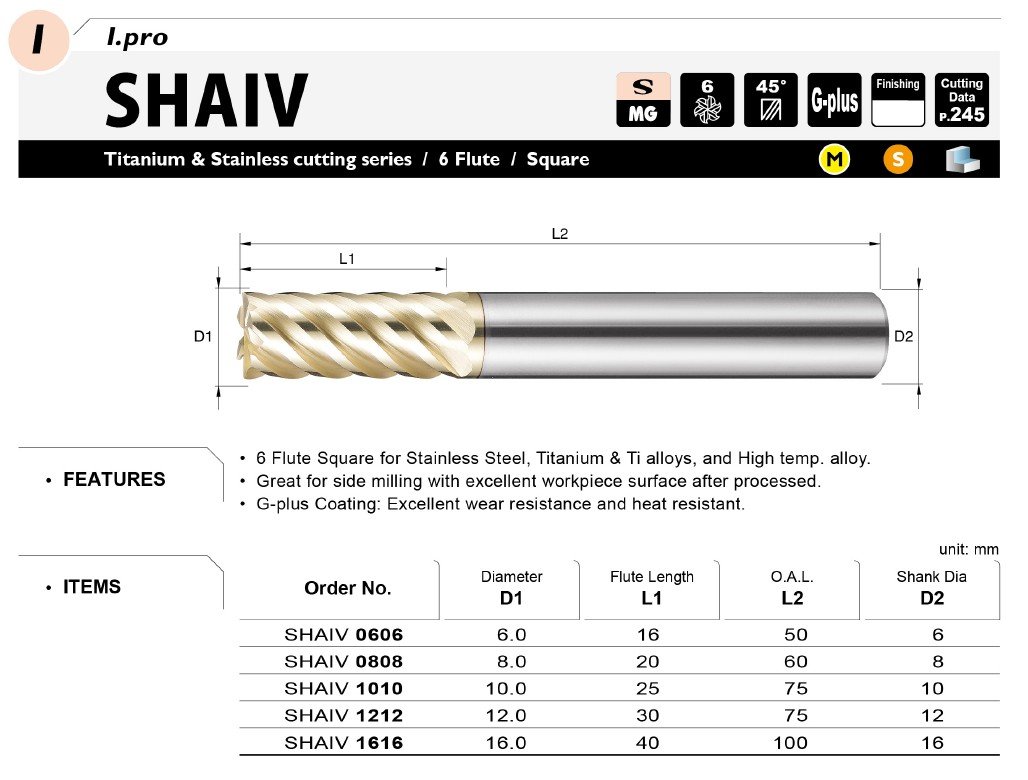 Čelní fréza pro nerezovou ocel titanové slitiny a žáruvzdorné slitiny. Technologie povlakování G-plus se vyznačuje tepelnou odolností a to do 1100 °C a odolností proti tření.