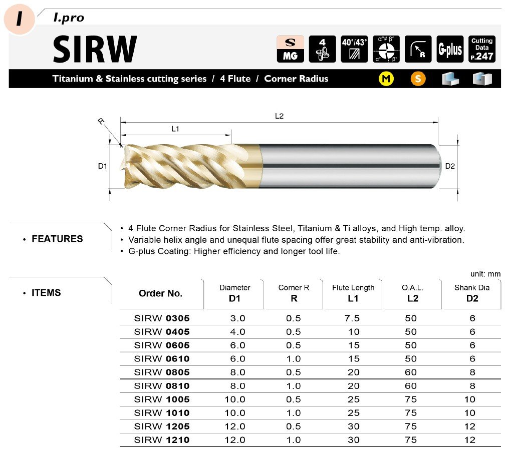 Čtyřbřitá fréza pro nerezovou ocel titanové slitiny a žáruvzdorné slitiny. Technologie povlakování G-plus se vyznačuje tepelnou odolností a to do 1100 °C a odolností proti tření.