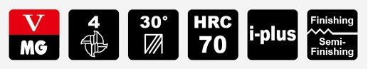 Základem je také kvalitní materiál se speciálním výbrusem pro obrábění materiálů do tvrdosti 70HRC. Vzhledem k náročnosti obrábění a tvrdosti obráběného materiálu je pro frézy V70 používán nejjemnější substrát o velikosti zrna 0,2µm s extrémně vysokou odolností vůči lomu a současně vynikající odolností vůči opotřebení.