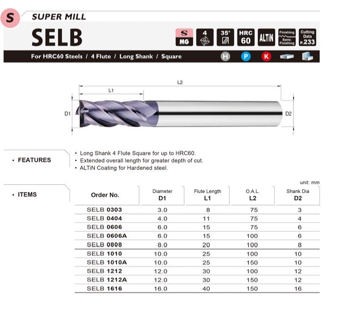 Základem je také kvalitní materiál se speciálním výbrusem pro obrábění materiálů do tvrdosti 60HRC. Vzhledem k náročnosti obrábění a tvrdosti obráběného materiálu je pro frézy používán substrát o velikosti zrna 0,5µm s vysokou odolností vůči lomu a současně vynikající odolností vůči opotřebení.
