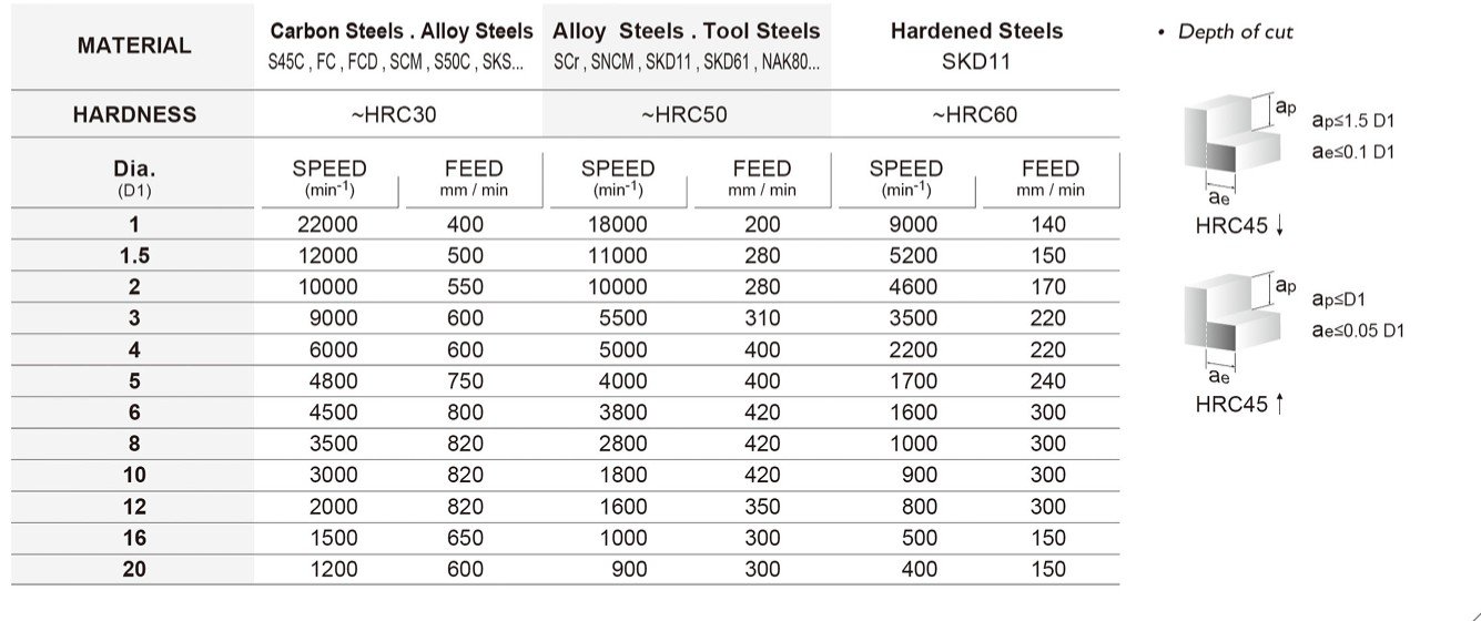 Základem je také kvalitní materiál se speciálním výbrusem pro obrábění materiálů do tvrdosti 60HRC. Vzhledem k náročnosti obrábění a tvrdosti obráběného materiálu je pro frézy používán substrát o velikosti zrna 0,5µm s vysokou odolností vůči lomu a současně vynikající odolností vůči opotřebení.