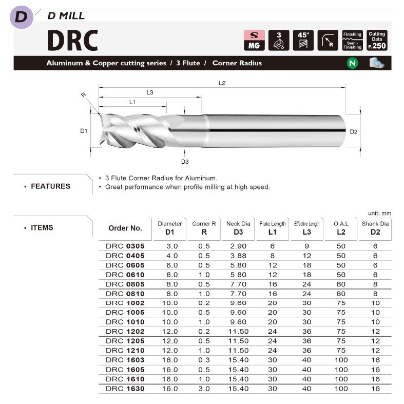Frézy typu DRC jsou vyrobeny ze substrátu s jemnou velikostí zrna 0,6 µm, což přispívá k vyšší odolnosti a dlouhé životnosti nástroje.