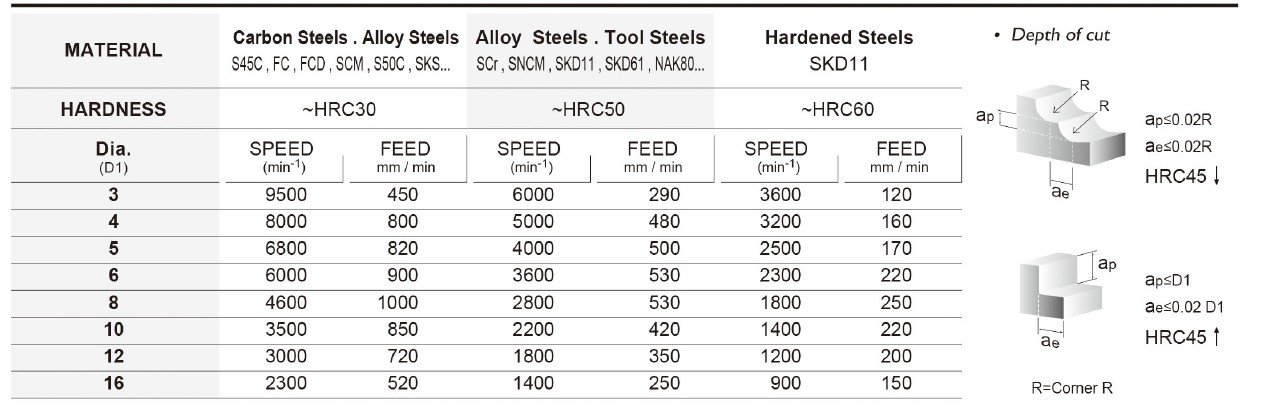 Základem je také kvalitní materiál se speciálním výbrusem pro obrábění materiálů do tvrdosti 55HRC. Vzhledem k náročnosti obrábění a tvrdosti obráběného materiálu je pro frézy ERB používán substrát o velikosti zrna 0,6µm s extrémně vysokou odolností vůči lomu a současně vynikající odolností vůči opotřebení.