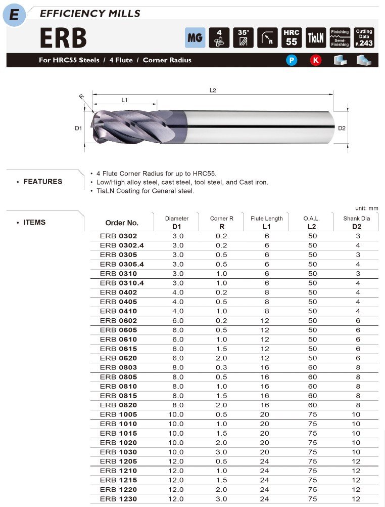Základem je také kvalitní materiál se speciálním výbrusem pro obrábění materiálů do tvrdosti 55HRC. Vzhledem k náročnosti obrábění a tvrdosti obráběného materiálu je pro frézy ERB používán substrát o velikosti zrna 0,6µm s extrémně vysokou odolností vůči lomu a současně vynikající odolností vůči opotřebení.
