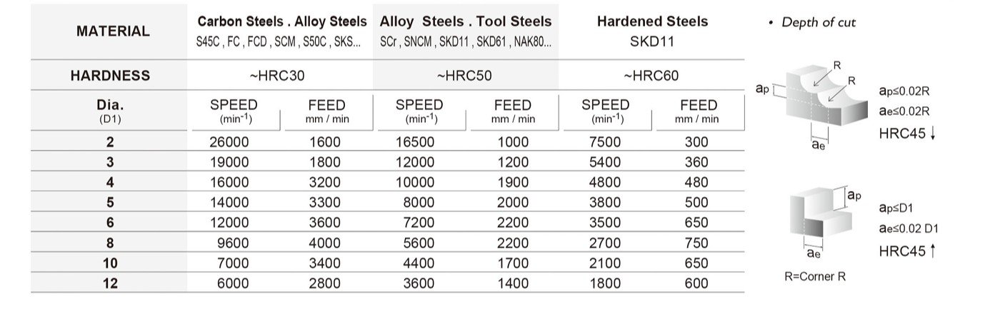 Čtyřbřitá fréza s rohovým rádiusem pro materiály do HRC65. Použití pro kalenou ocel, litina, nízko a vysokolegovanou ocel, litou ocel a nástrojovou ocel.