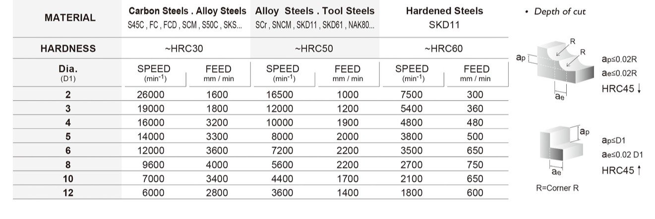 Základem je také kvalitní materiál se speciálním výbrusem pro obrábění materiálů do tvrdosti 65HRC. Vzhledem k náročnosti obrábění a tvrdosti obráběného materiálu je pro frézy používán nejjemnější substrát o velikosti zrna 0,2µm s extrémně vysokou odolností vůči lomu a současně vynikající odolností vůči opotřebení.