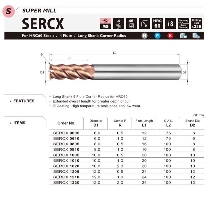 Základem je také kvalitní materiál se speciálním výbrusem pro obrábění materiálů do tvrdosti 60HRC. Vzhledem k náročnosti obrábění a tvrdosti obráběného materiálu je pro frézy používán substrát o velikosti zrna 0,5µm s vysokou odolností vůči lomu a současně vynikající odolností vůči opotřebení.