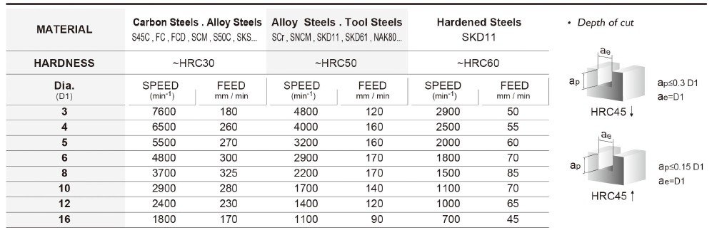 Základem je také kvalitní materiál se speciálním výbrusem pro obrábění materiálů do tvrdosti 60HRC. Vzhledem k náročnosti obrábění a tvrdosti obráběného materiálu je pro frézy používán substrát o velikosti zrna 0,5µm s vysokou odolností vůči lomu a současně vynikající odolností vůči opotřebení.