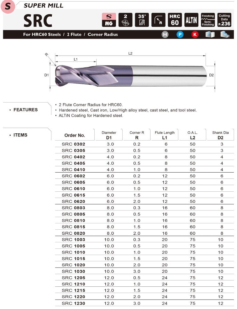 Základem je také kvalitní materiál se speciálním výbrusem pro obrábění materiálů do tvrdosti 60HRC. Vzhledem k náročnosti obrábění a tvrdosti obráběného materiálu je pro frézy používán substrát o velikosti zrna 0,5µm s vysokou odolností vůči lomu a současně vynikající odolností vůči opotřebení.