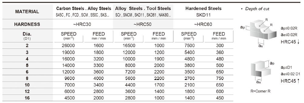Rohový rádius zvyšuje pevnost řezné hrany a prodlužuje životnost nástroje. Vzhledem k náročnosti obrábění a tvrdosti obráběného materiálu je pro frézy SRK používán substrát o velikosti zrna 0,5µm s vysokou odolností vůči lomu.
