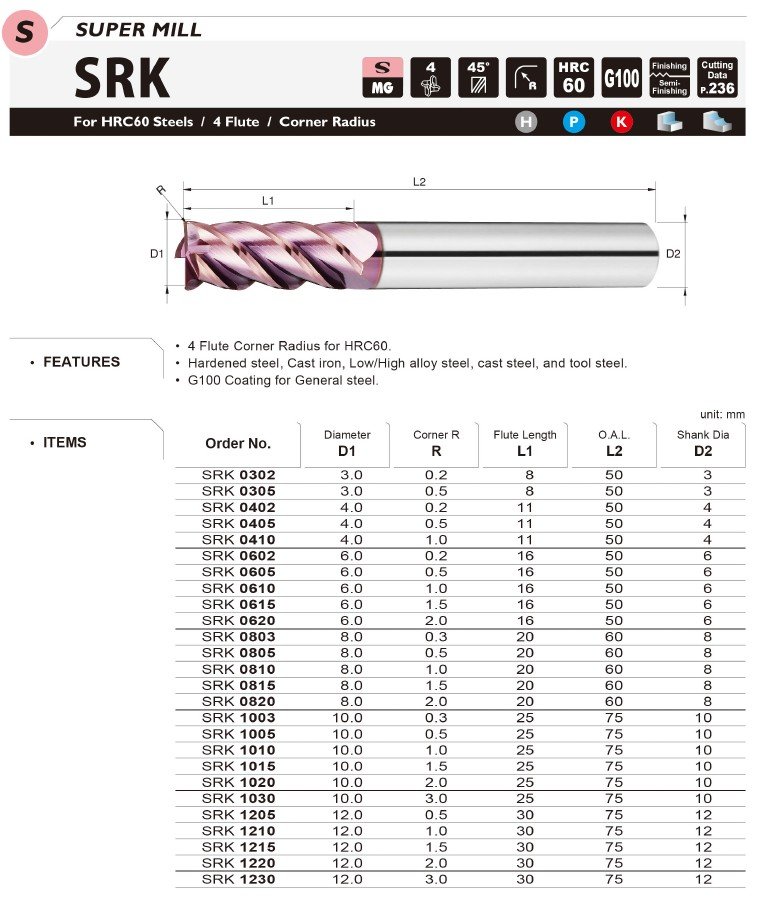 Rohový rádius zvyšuje pevnost řezné hrany a prodlužuje životnost nástroje. Vzhledem k náročnosti obrábění a tvrdosti obráběného materiálu je pro frézy SRK používán substrát o velikosti zrna 0,5µm s vysokou odolností vůči lomu.
