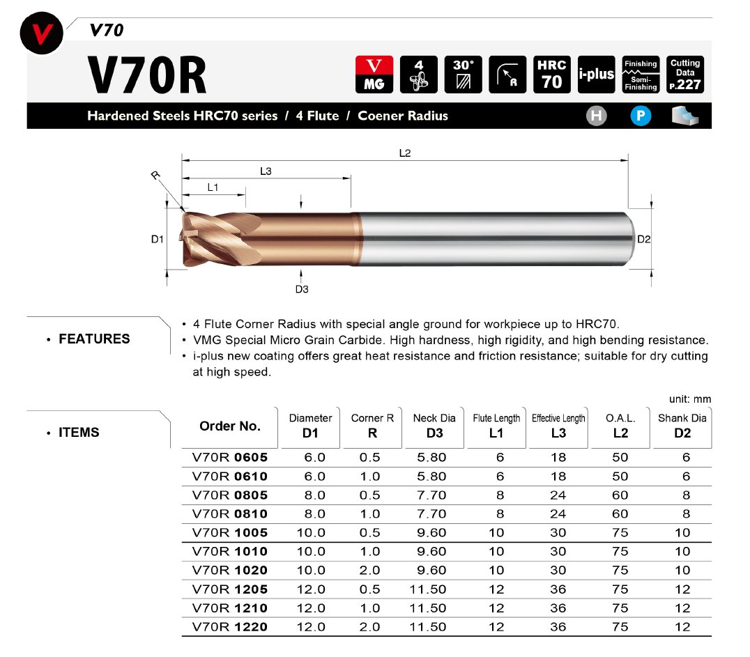 Základem je také kvalitní materiál se speciálním výbrusem pro obrábění materiálů do tvrdosti 70HRC. Vzhledem k náročnosti obrábění a tvrdosti obráběného materiálu je pro frézy V70 používán nejjemnější substrát o velikosti zrna 0,2µm s extrémně vysokou odolností vůči lomu a současně vynikající odolností vůči opotřebení.