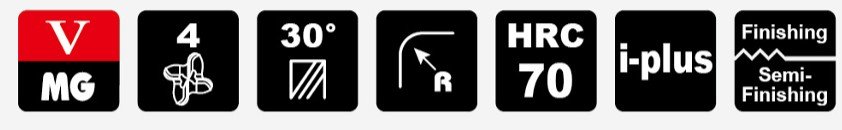 Základem je také kvalitní materiál se speciálním výbrusem pro obrábění materiálů do tvrdosti 70HRC. Vzhledem k náročnosti obrábění a tvrdosti obráběného materiálu je pro frézy V70 používán nejjemnější substrát o velikosti zrna 0,2µm s extrémně vysokou odolností vůči lomu a současně vynikající odolností vůči opotřebení.