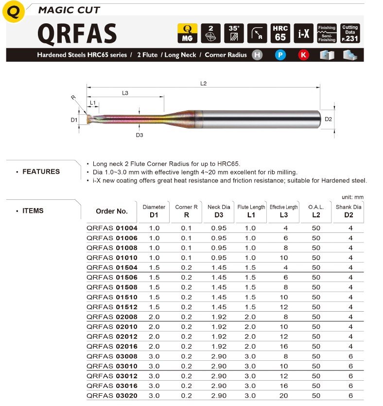 Dvoubřitá fréza s dlouhým krkem a čtvercovou stopkou je určena pro obrábění kalené oceli až do tvrdosti HRC65. Nabízí průměry v rozsahu 1,0–3,0 mm a efektivní délku řezu 4–20 mm.
