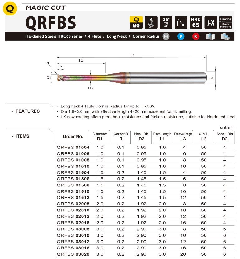 Čtyřbřitá fréza s dlouhým krkem a čtvercovou stopkou je určena pro obrábění kalené oceli až do tvrdosti HRC65. Nabízí průměry v rozsahu 1,0–3,0 mm a efektivní délku řezu 4–20 mm.