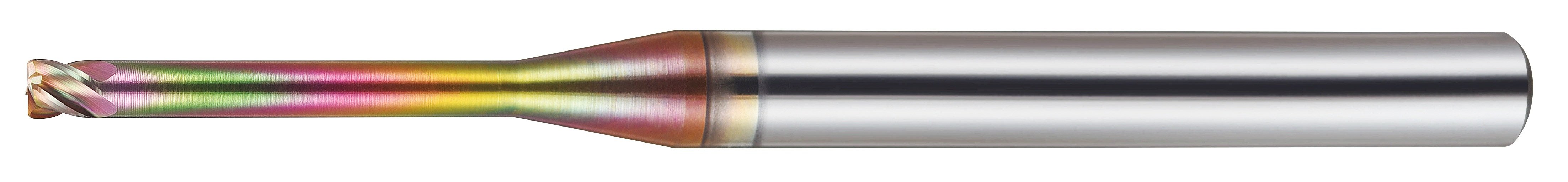 Čtyřbřitá fréza s dlouhým krkem a čtvercovou stopkou je určena pro obrábění kalené oceli až do tvrdosti HRC65. Nabízí průměry v rozsahu 1,0–3,0 mm a efektivní délku řezu 4–20 mm.