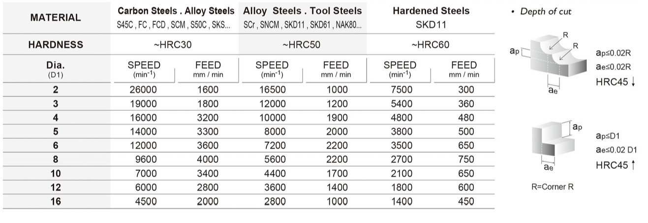 Základem je také kvalitní materiál se speciálním výbrusem pro obrábění materiálů do tvrdosti 60HRC. Vzhledem k náročnosti obrábění a tvrdosti obráběného materiálu je pro frézy používán substrát o velikosti zrna 0,5µm s vysokou odolností vůči lomu a současně vynikající odolností vůči opotřebení.