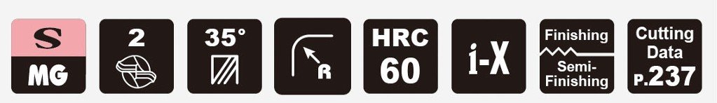 Dlouhá 2břitá kulová fréza pro HRC60. Poloměr R 1,0–R2,0 mm s efektivní délkou 4–20 mm. Vynikající pro frézování žeber.