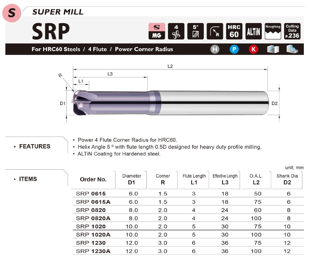 Úhel šroubovice 5° a délka břitu 0,5D pro těžké profilové frézování. Vzhledem k náročnosti obrábění a tvrdosti obráběného materiálu je pro frézy SRP používán substrát o velikosti zrna 0,5µm s vysokou odolností vůči lomu.