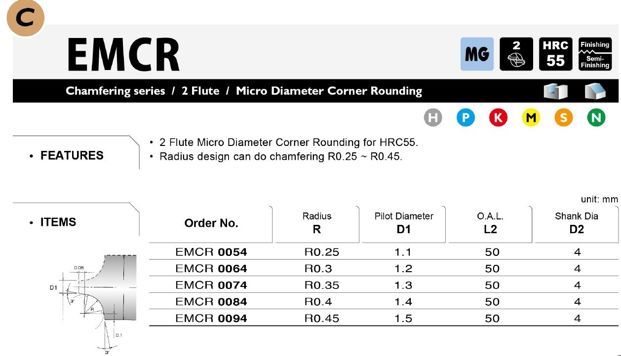 Dvoubřitá zaoblovací micro fréza určená pro obrábění materiálů do tvrdosti 55 HRC. Speciální konstrukce rádiusu umožňuje srážení hran v rozsahu R0,5 až R6,0, což zajišťuje univerzální použití při dokončovacích operacích.