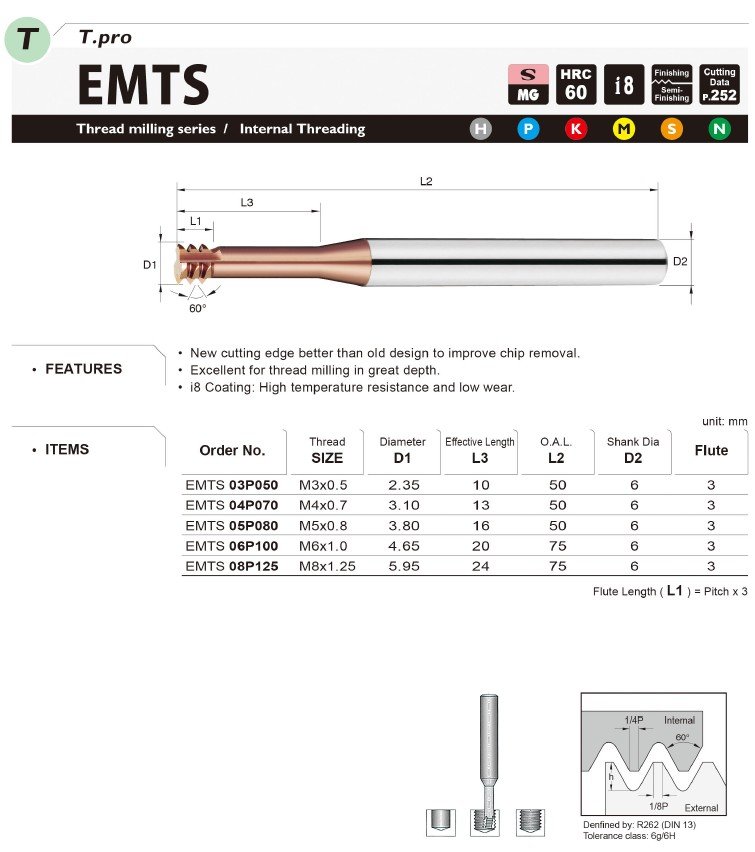 Frézy EMTS představují vysoce výkonný nástroj pro závitové frézování s vynikajícími výsledky i ve větších hloubkách. Inovovaná řezná hrana přináší výrazně lepší odvod třísek oproti předchozím konstrukcím, čímž zvyšuje stabilitu obrábění a snižuje riziko zalomení nástroje.