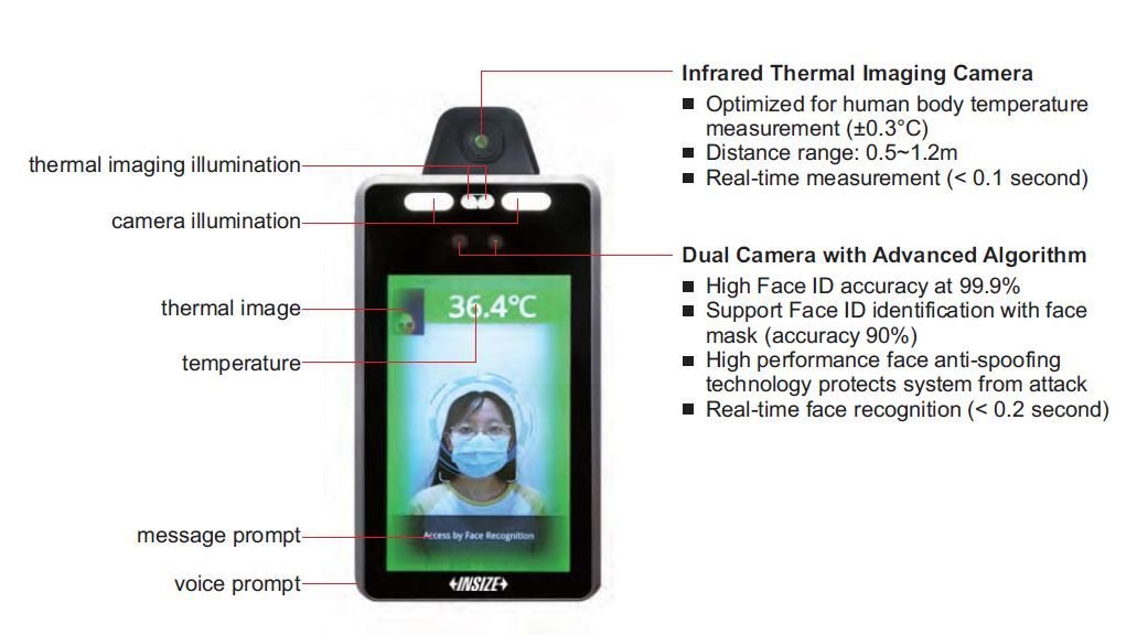 rozpoznávání obličeje v kombinaci a infračervenou termokameru s vysokým rozlišením, která umožňuje přesné měření teploty.