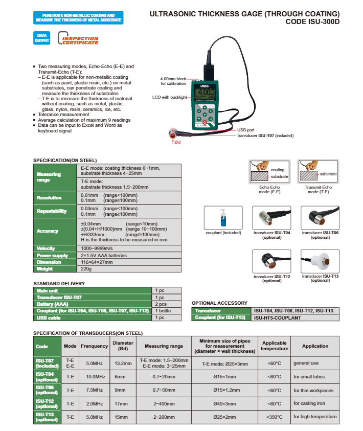 Ultrazvukový přístroj pro měření tloušťky stěny INSIZE ISU-300D (s přenosem dat)