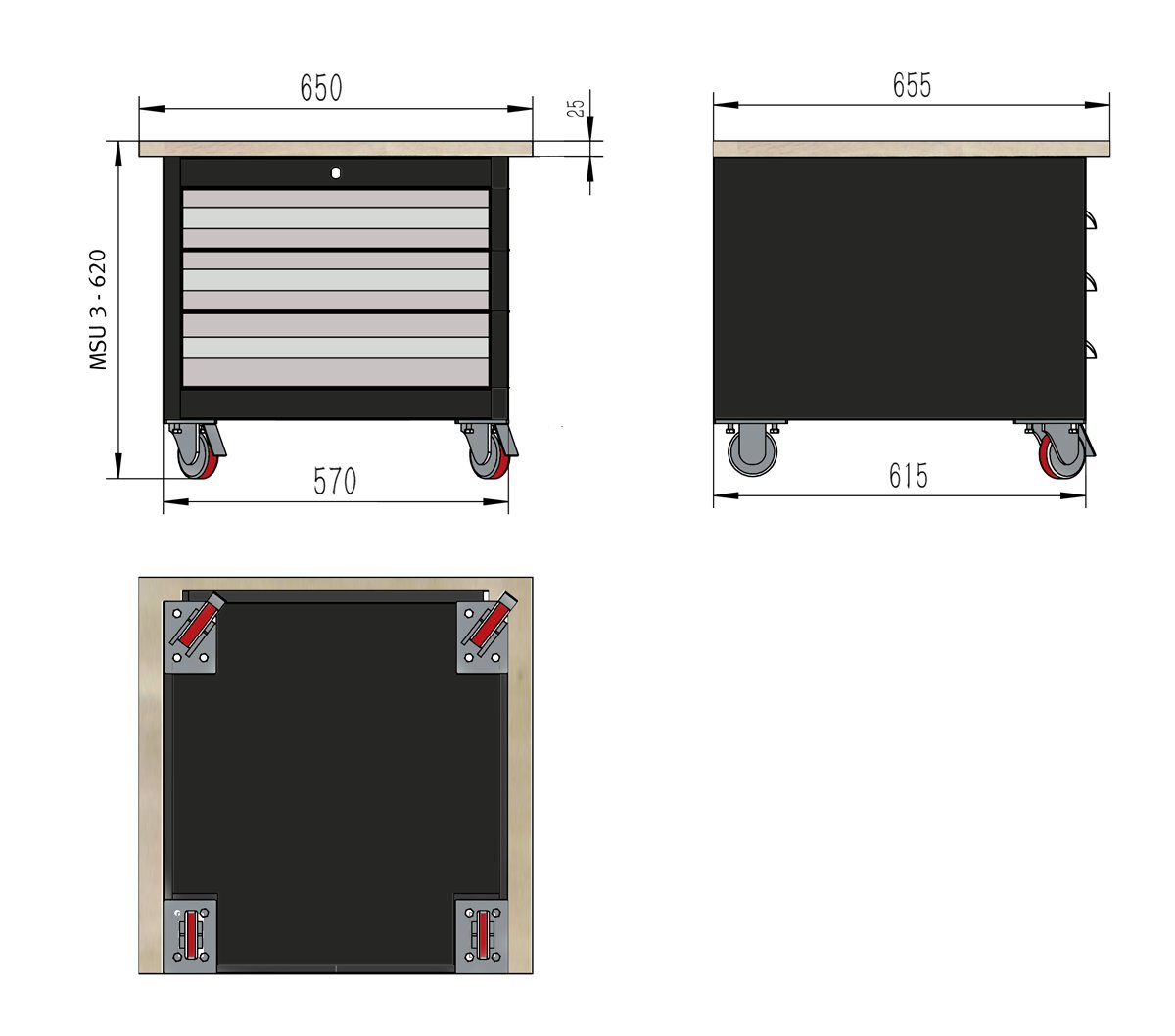Univerzální pojízdný podstavec / montážní stůl se třemi uzamykatelnými zásuvkami.