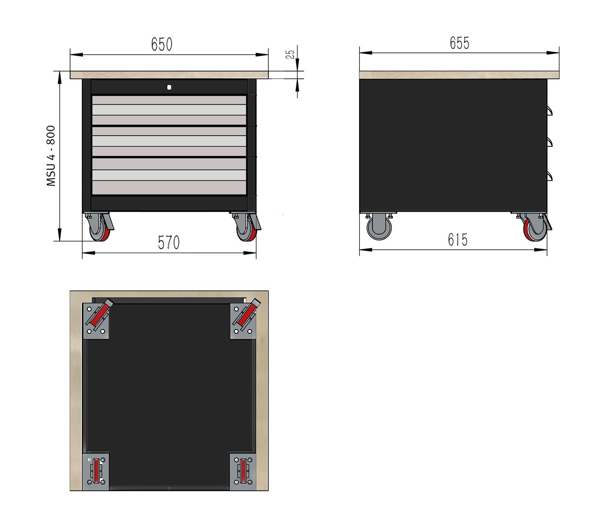 Univerzální pojízdný podstavec / montážní stůl se třemi uzamykatelnými zásuvkami.