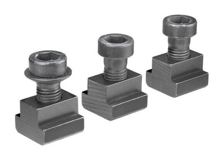 Upevňovací sada pro ploché upínače obsahuje 3 šrouby s vnitřním šestihranem podle DIN 6912, 3 T-matice do drážky podle DIN 508 a 1 kulovou podložku podle DIN 6319C.