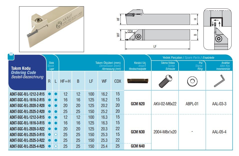 Tělo nástroje je vyrobeno z kvalitní oceli. VBD je upevněna standardním způsobem shora pomocí šroubku což zajišťuje stabilní upnutí řezné destičky. Pro nože AKKO jsou používány kované upínky a šroubky z produkce Švýcarského výrobce SFS. Tyto držáky jsou opatřeny povlakem stříbrné… Více