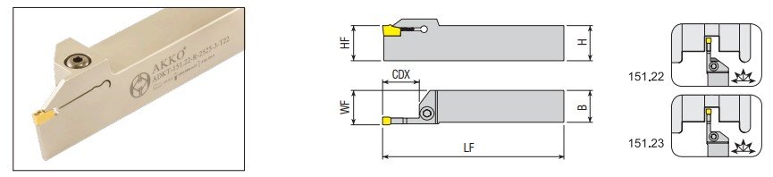 Tělo nástroje je vyrobeno z kvalitní oceli. VBD je upevněna standardním způsobem shora pomocí šroubku což zajišťuje stabilní upnutí řezné destičky. Pro nože AKKO jsou používány kované upínky a šroubky z produkce Švýcarského výrobce SFS. Tyto držáky jsou opatřeny povlakem stříbrné… Více