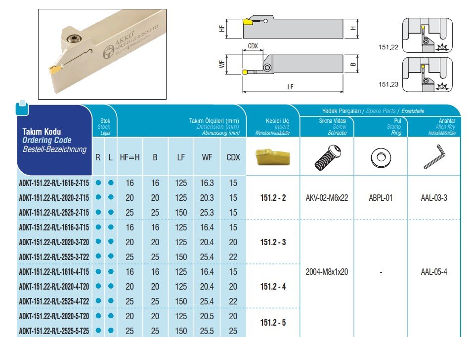 Tělo nástroje je vyrobeno z kvalitní oceli. VBD je upevněna standardním způsobem shora pomocí šroubku což zajišťuje stabilní upnutí řezné destičky. Pro nože AKKO jsou používány kované upínky a šroubky z produkce Švýcarského výrobce SFS. Tyto držáky jsou opatřeny povlakem stříbrné… Více