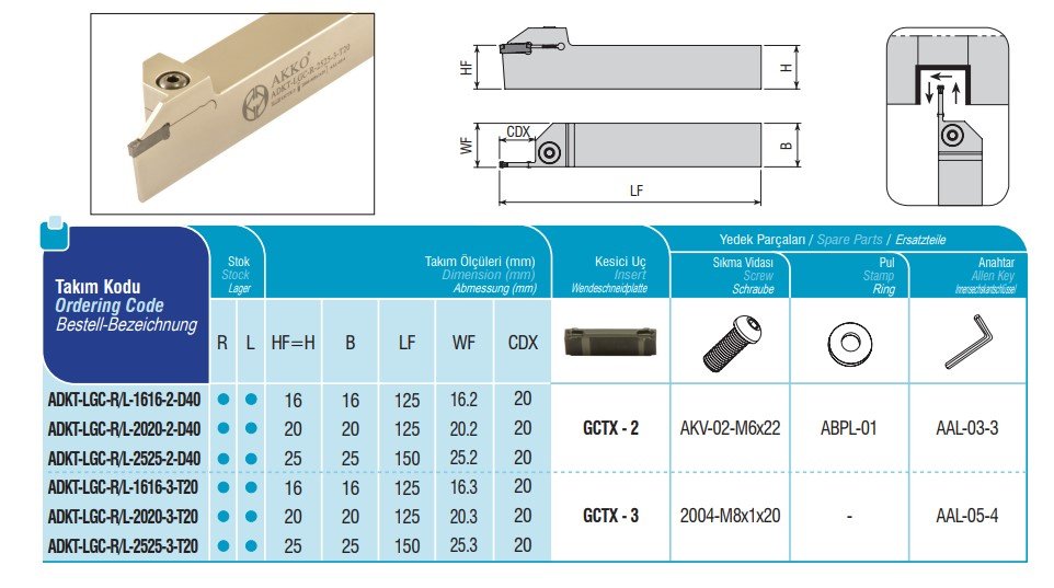 Tělo nástroje je vyrobeno z kvalitní oceli. VBD je upevněna standardním způsobem shora pomocí šroubku což zajišťuje stabilní upnutí řezné destičky. Pro nože AKKO jsou používány kované upínky a šroubky z produkce Švýcarského výrobce SFS. Tyto držáky jsou opatřeny povlakem stříbrné… Více