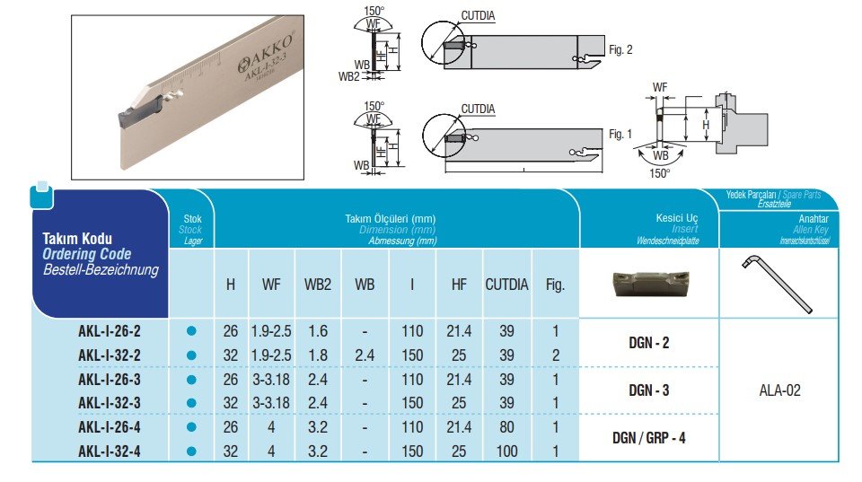 Tělo nástroje je vyrobeno z kvalitní oceli. Nástroj je opatřen povlakem ALPHA COATING, který zajišťuje korozivzdornost a dostatečnou odolnost proti vnějším vlivům jako např. teplotám vznikajícím při obrábění. Upichovací planžety se upínají do držáků AKKO ALBU viz. související produkty.