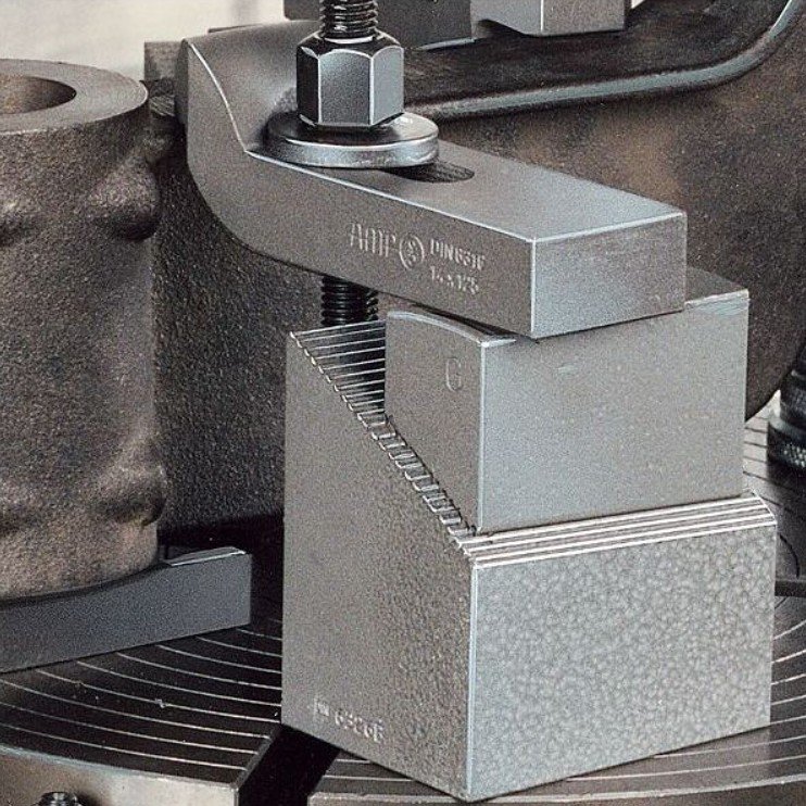 Upínací podložka, plynule nastavitelná, jednotlivé díly se šikmým ozubením ze zušlechtěná oceli, lakované.