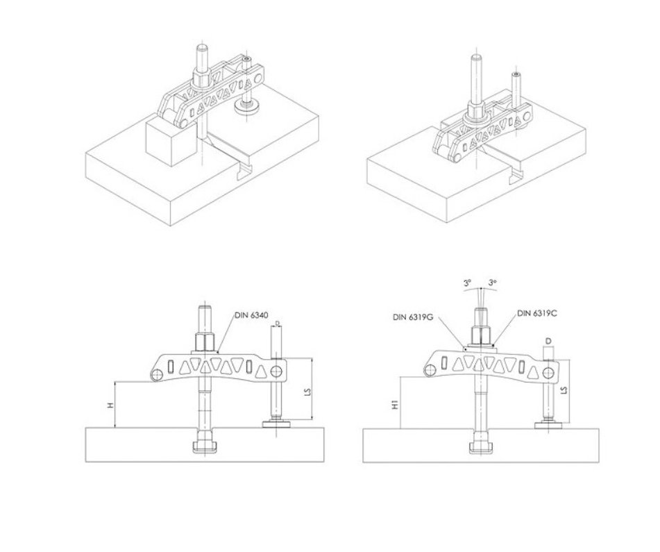 Upínač se používá pro všechny upínací úlohy, při kterých je upínání realizováno prostřednictvím T-drážek, podélných drážek a závitových otvorů.Pro upínání lze použít buď upínací šrouby DIN 787, čepy se závitem DIN 6379 nebo šrouby s válcovou hlavou ISO 4762.